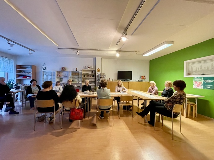 ![]() Kaikki paikalla olleet eivät tähän kuvaan mahtuneet. Taustalla näkyvän television edessä istuu vieraamme reumahoitaja Virpi Niittymäki. |
