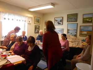 Reumareippaat Käsityöasemalla.Kahvihuoneen seinillä oli ihasteltavina hienoja tauluja, joita yhdessä huoneessa työtilaa pitävät harrastajat olivat saaneet aikaan.